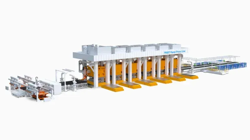 產線特點:滿足鋼鋁板生產、機械人末端配置Aotto 七軸,實現了壓機間平移搬運沖壓件整線配備了Aotto清洗機、涂油機;可以生產汽車外覆蓋件,連續模式下節拍可達12SPM,配備ATC可以實現3分鐘自動更換端拾器。